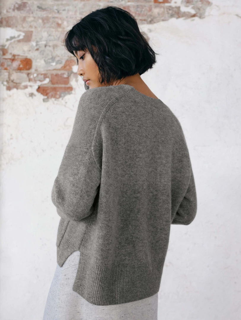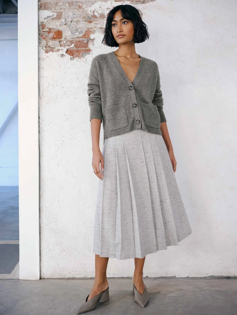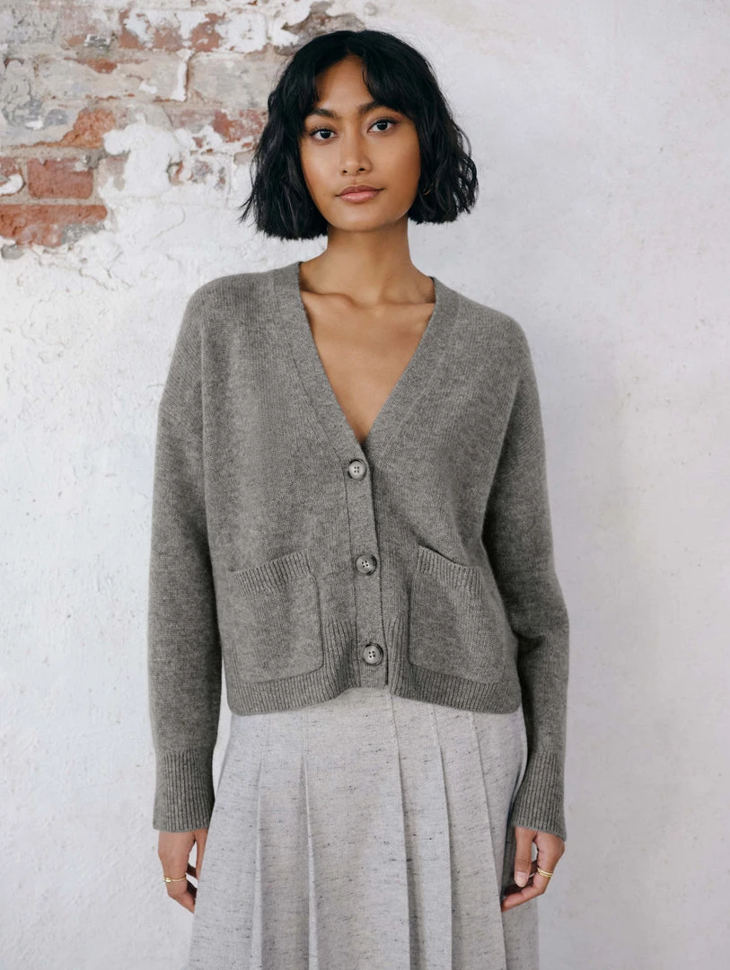 A trend seen on the runway and one to covet now, the Cashmere Cropped V Neck Cardigan presents endless styling possibilities. The cropped, roomier fit is especially flattering with high-waisted jeans or pants.