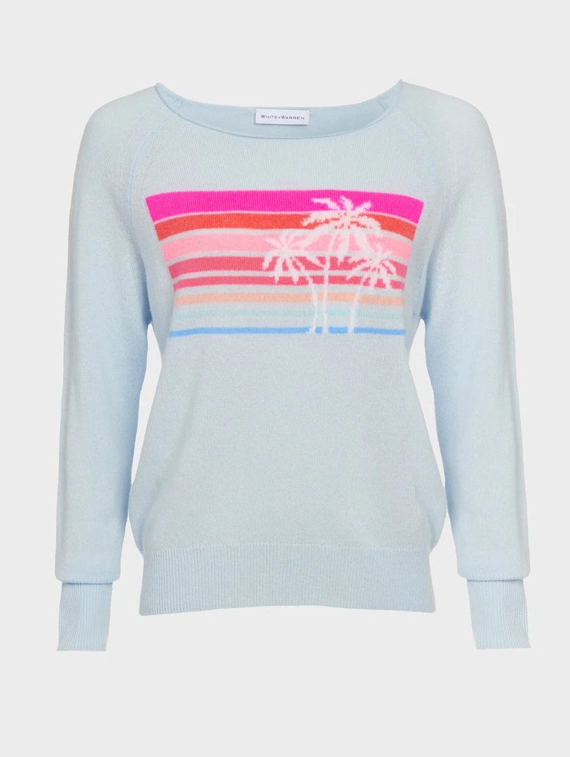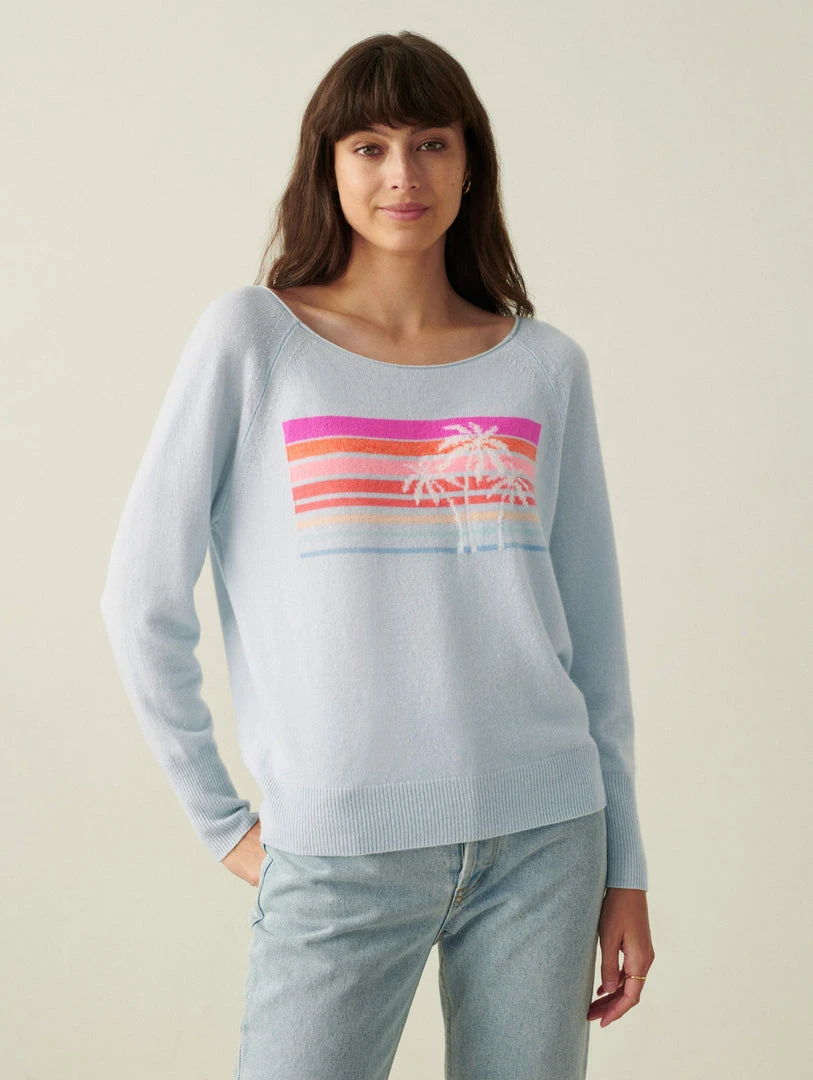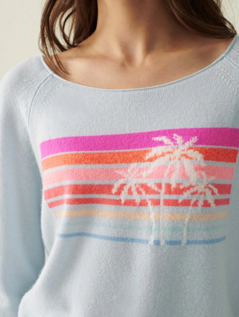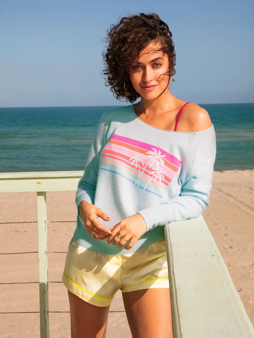California dreaming is alive and well with this cashmere sweatshirt. With an oversized neckline, it falls slightly off one shoulder, and to drive the Malibu vibe home, it features a colorful intarsia sunset design across the chest. Throw it on over your swimsuit post-swim.