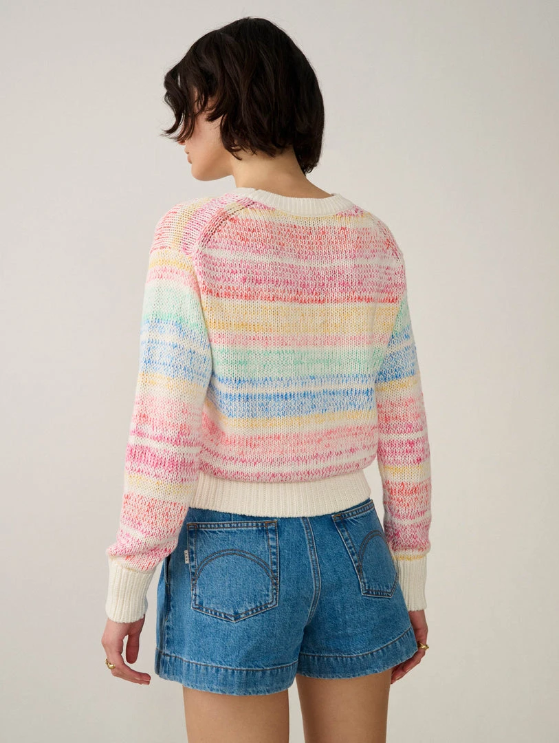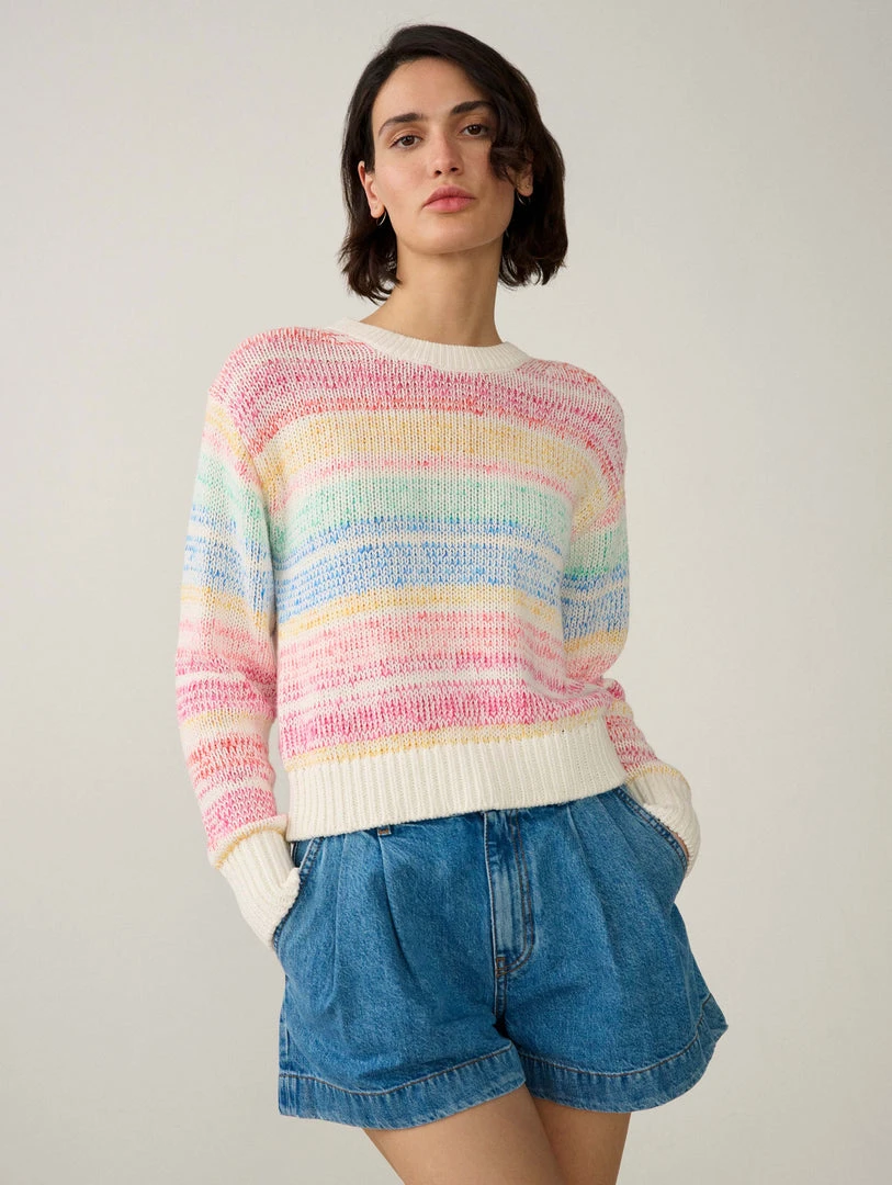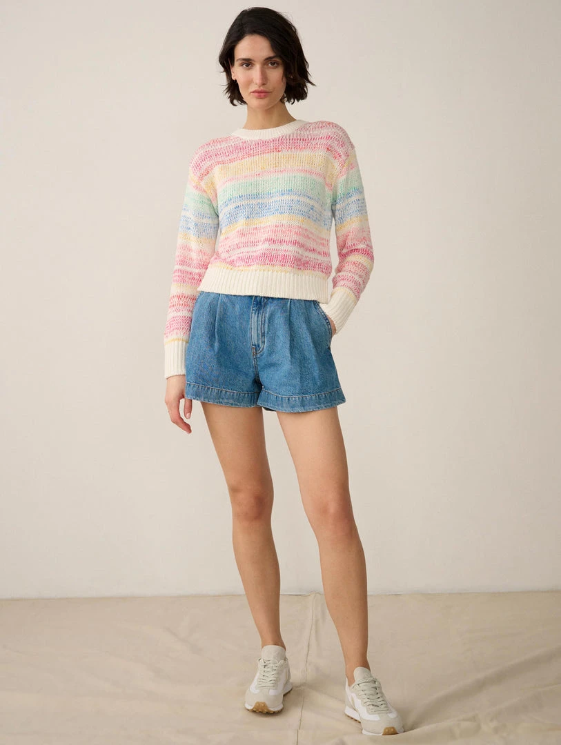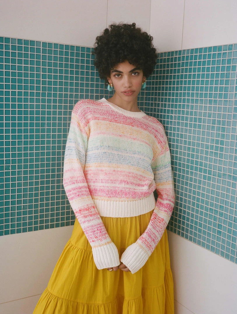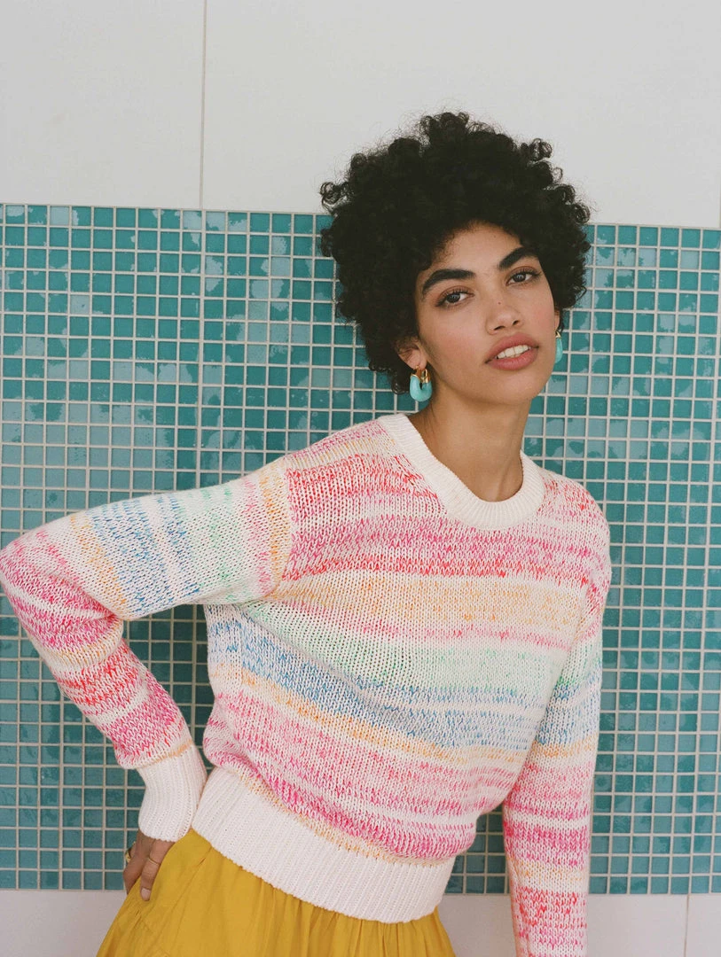 The Cotton Marled Striped Crewneck is just the piece to infuse a bit of color and texture into your look. It’s spun from BCI-certified cotton for a lofty handle and has a nostalgic feel thanks to its rainbow-colored, marled effect. The shrunken fit works well with high-waisted jeans or skirts.