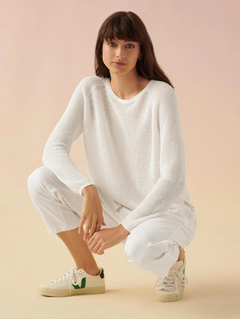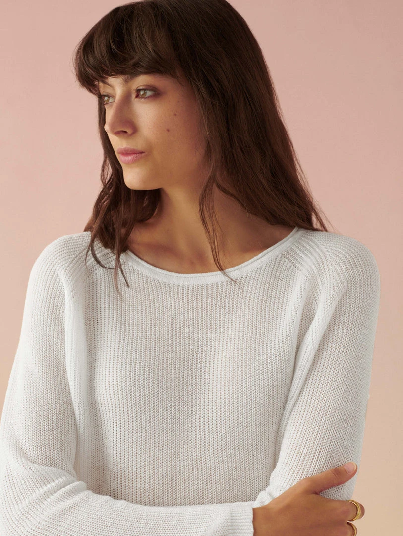 Our newest crewneck is your one-way ticket to breezing through summer. All over ribbing lends polish to the linen sweater, while its shrunken sweatshirt shape pairs perfectly with high-waisted separates. We think it looks equally chic with shorts as it does a skirt.