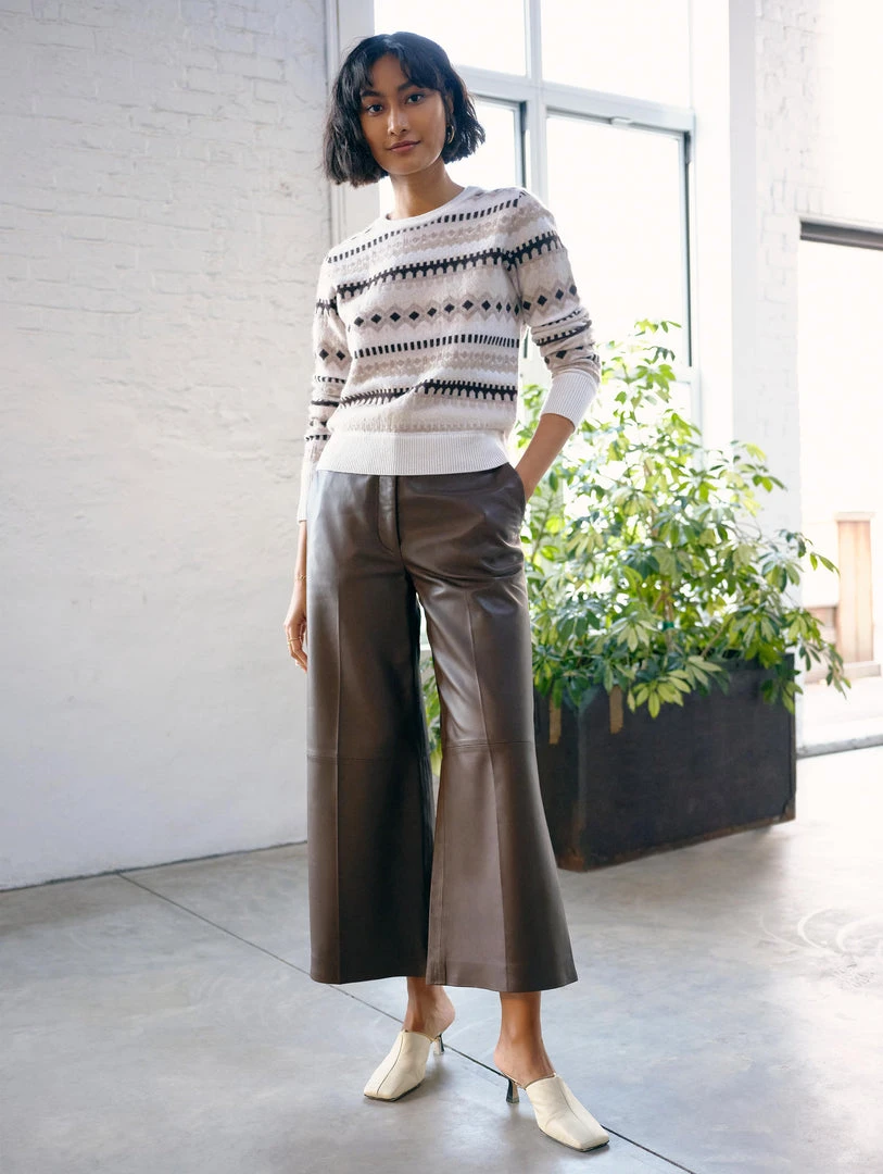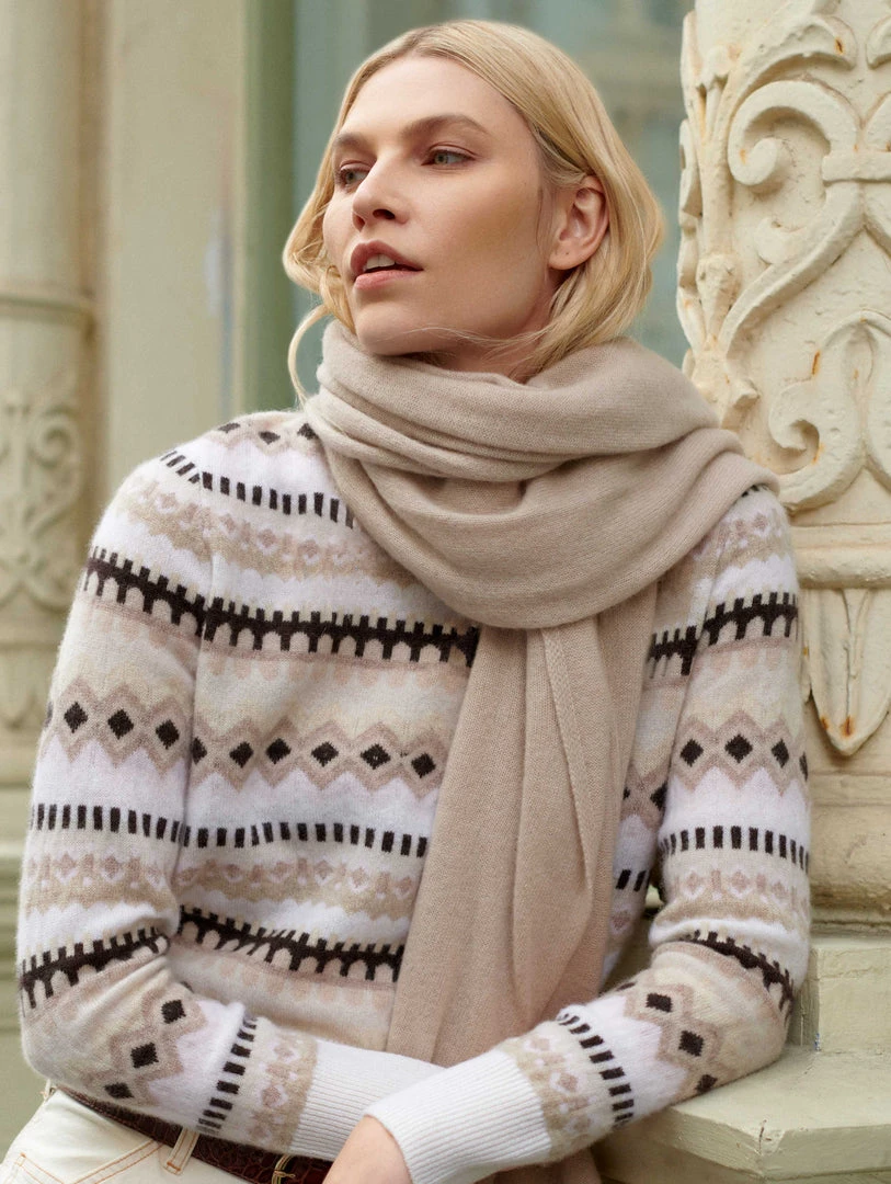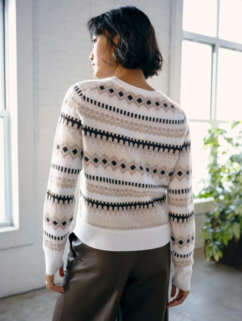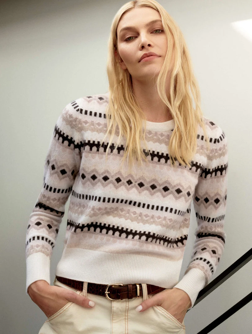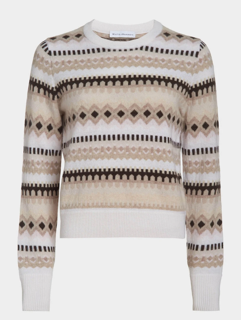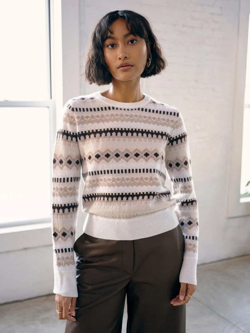 This Cashmere Fair Isle Crewneck sweater is a nod to retro winter style, perfect for days lounging at home by the fire or indulging in après-ski activities. The geometric Fair Isle pattern is a fun, playful update to the classic motif. We love styling it with white denim for a fresh take on cold-weather dressing.