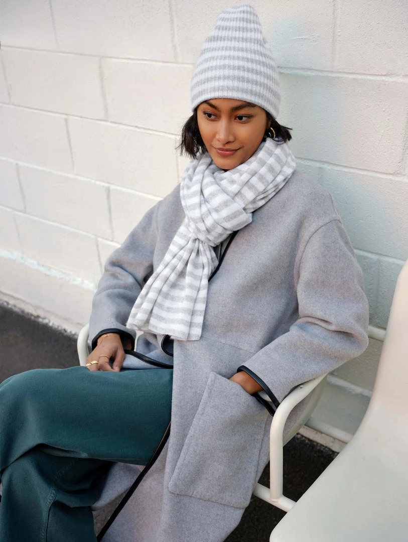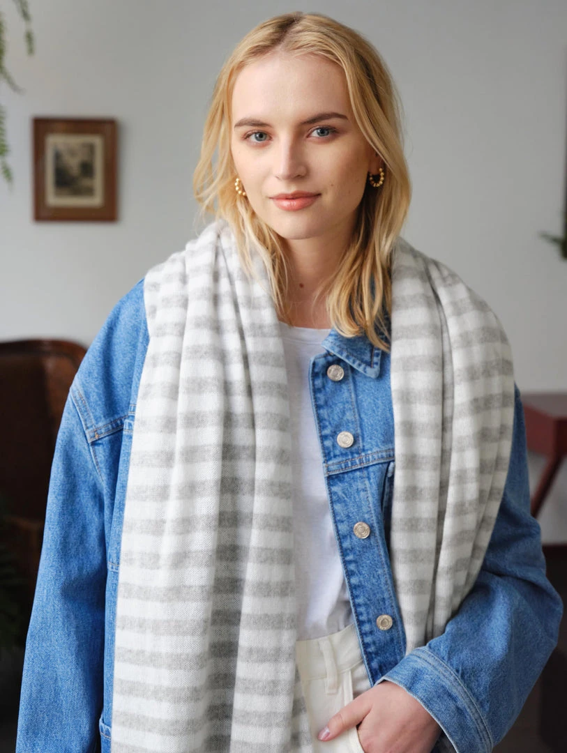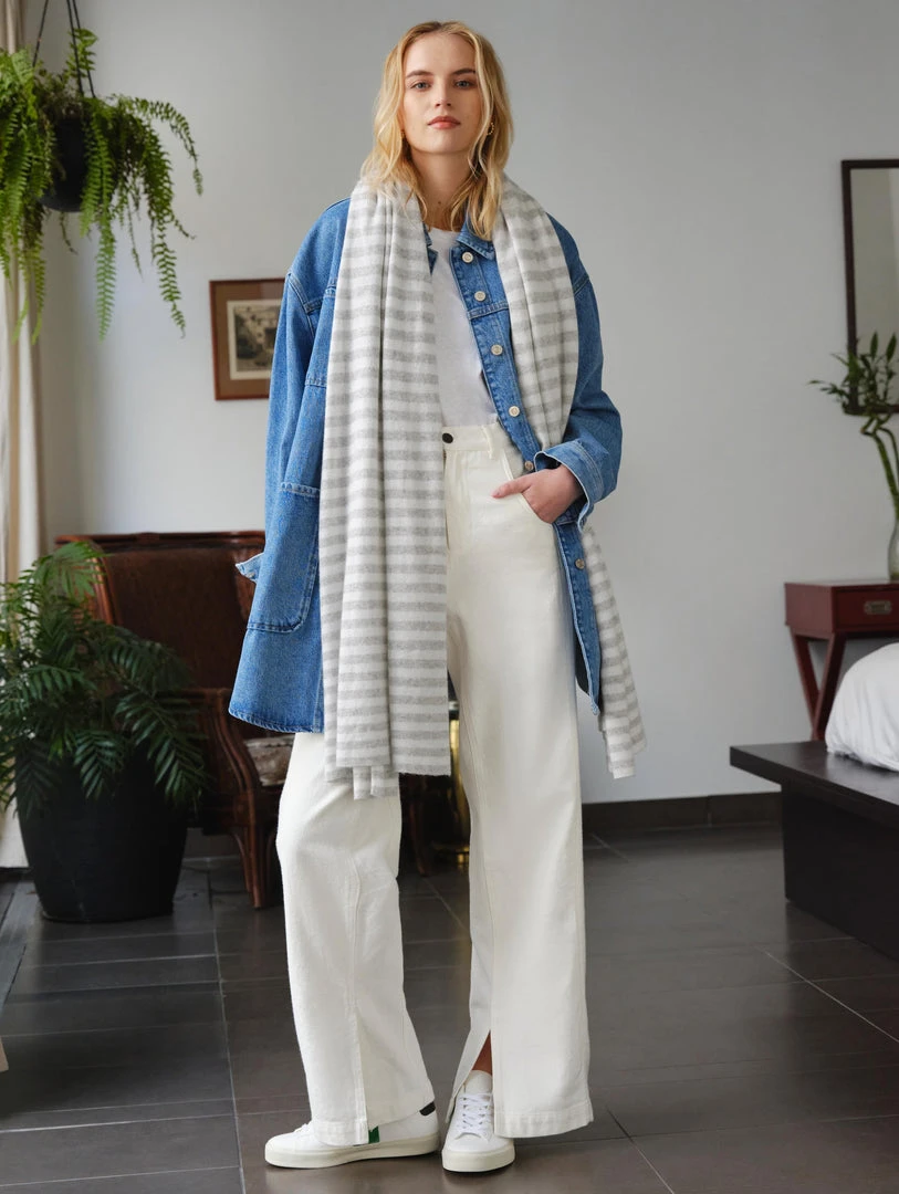 This Cashmere Striped Travel Wrap is a perfect addition to your scarf rotation. Patterned with neutral stripes, this wrap will complement just about any sweater or jacket in your closet. Wear it tied around your neck or draped over your shoulders depending on the weather (and your mood).