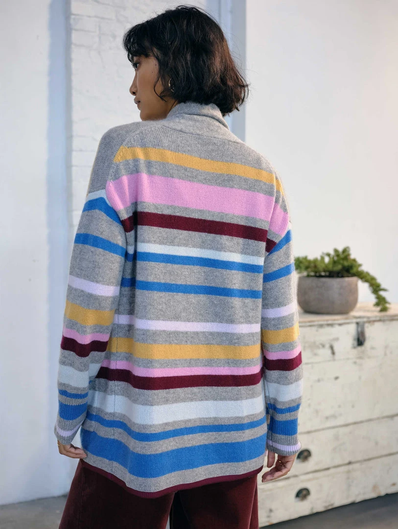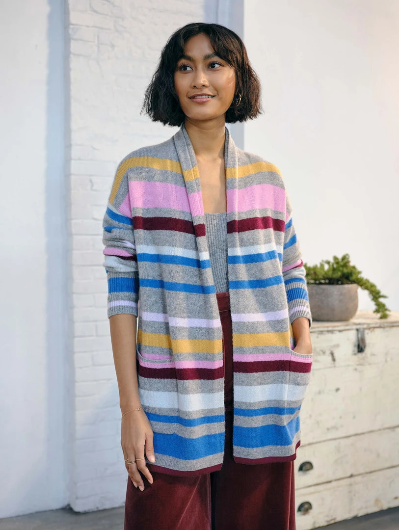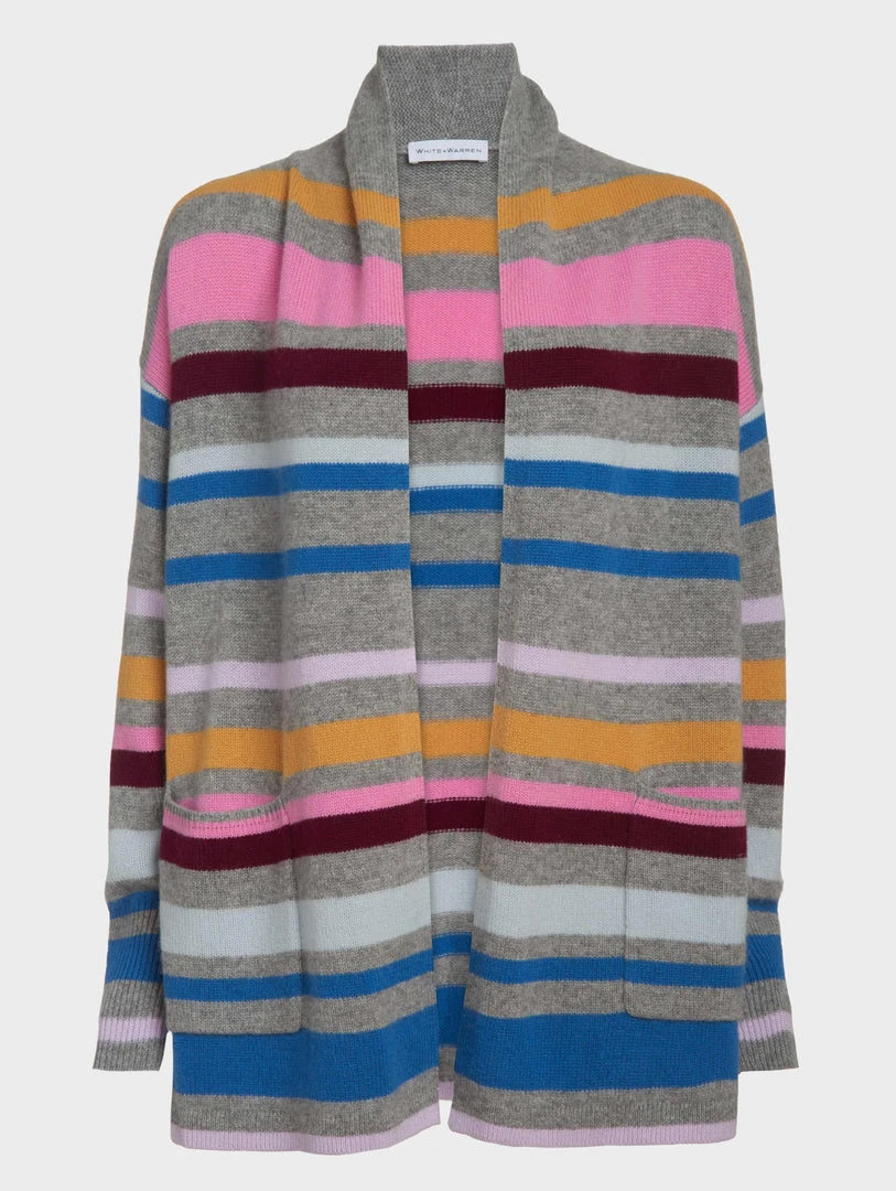 The Luxe Cashmere Striped Cardigan features an updated stripe motif in a wrap silhouette that can be cinched at the waist with the accompanying belt. The lofty cashmere handle and longer length feels blissfully soft and warm. Consider it the kind of cozy style you’ll want to wear over a lighter knit or tee on weekends.