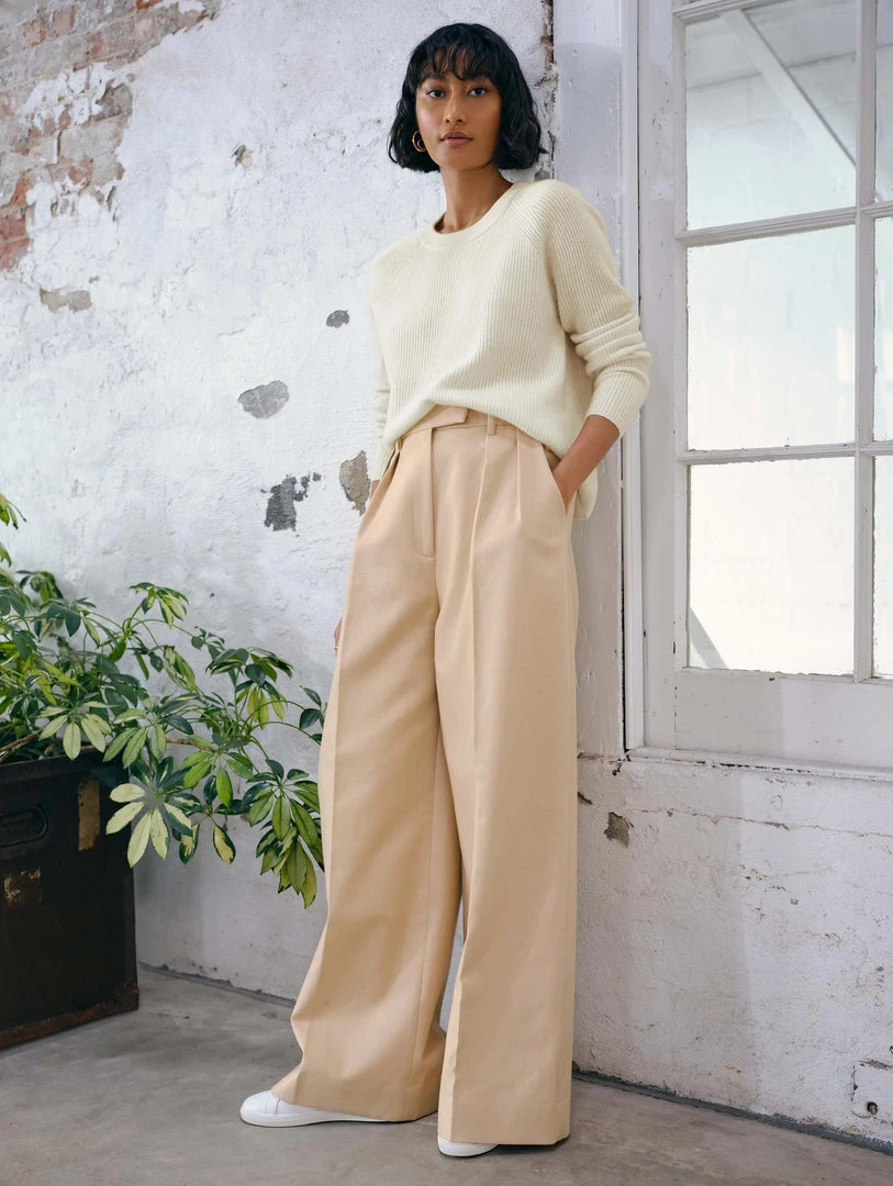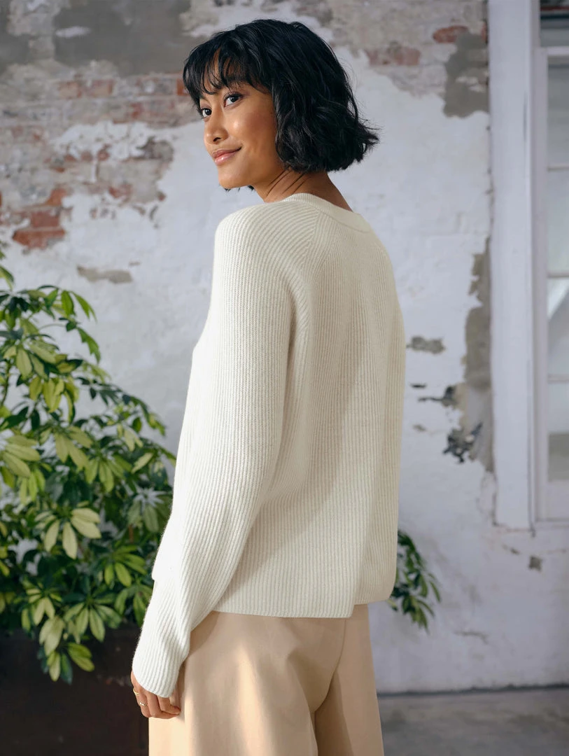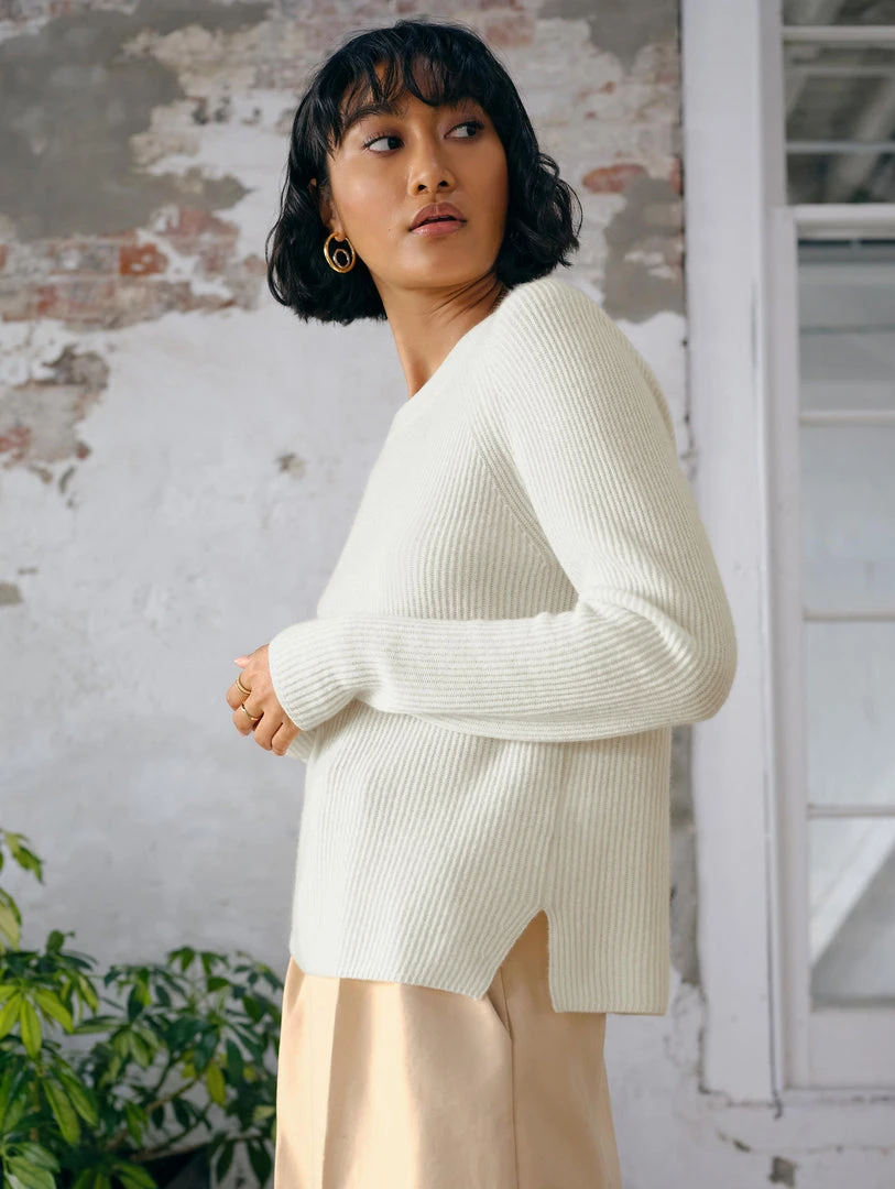 This Recycled Cashmere Ribbed Crewneck features a roomier silhouette around the body and fitted raglan sleeves. The perfect knit for days on-the-go, pair with denim for a casual yet pulled-together look.
